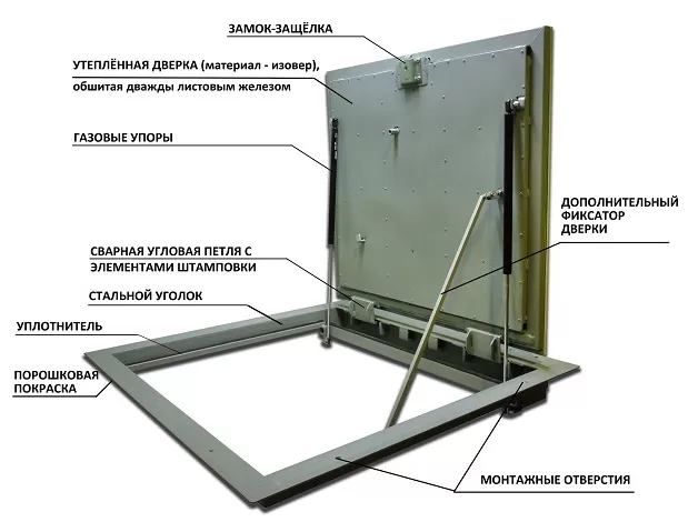 Противопожарные люки изготавливают из толстых стальных листов, которые сгибаются в профиль рамы. Между ними укладывается теплоизоляционный материал, что не подвергается горению. Обычно это минеральные или базальтовые плиты. Такой наполнитель в обычное время еще и защищает от холода, надежно изолирует тепло в помещении.