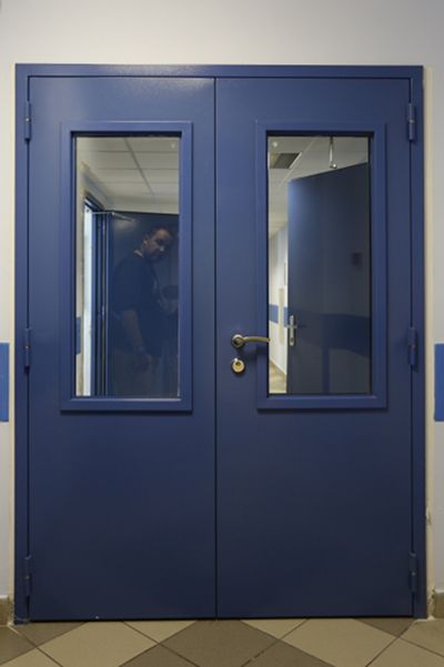 Противопожарная алюминиевая дверь синего цвета в Домодедово